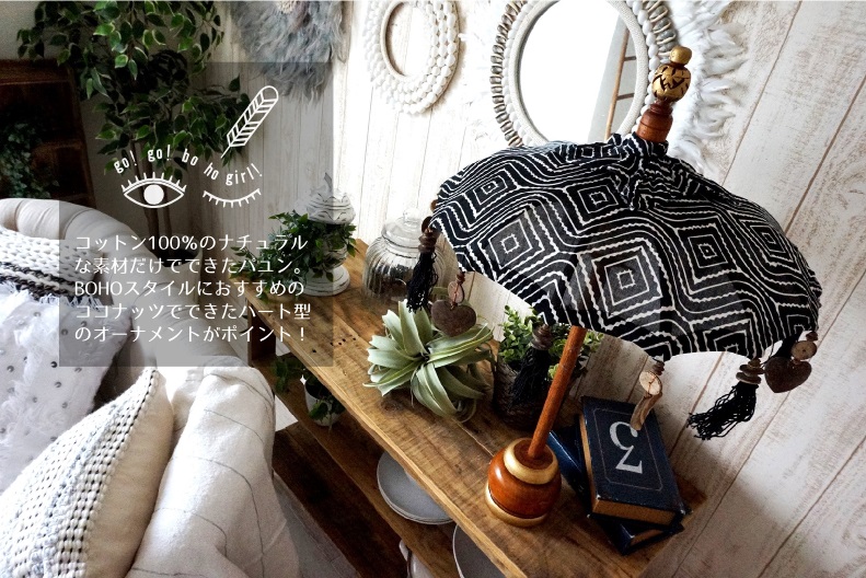パラソル部分のかぎ編みとゆらゆらとしたフリンジがナチュラルな<パユンボッサ>です。