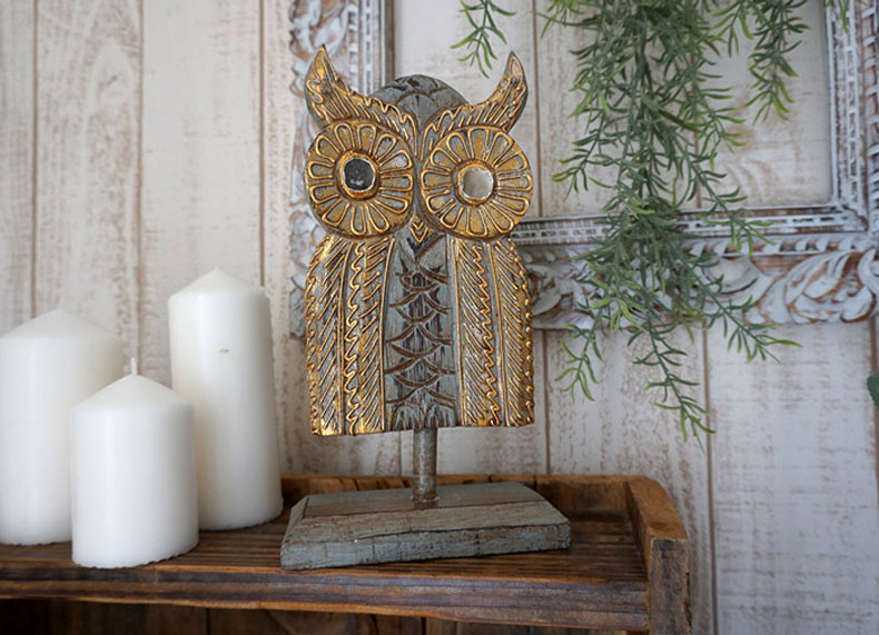 フクロウの木製オブジェ <アウル シャビーグリーン>