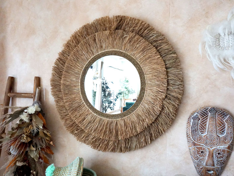グラスをたっぷりと編み込んだボサボサの素材感が特徴のウォールミラー<ボーホーボッサミラー>