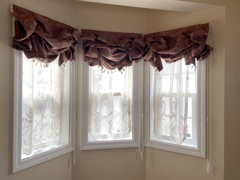 シェードはトルコ刺繍の絵羽を残したり、掃出し窓は2倍ヒダにしたり
