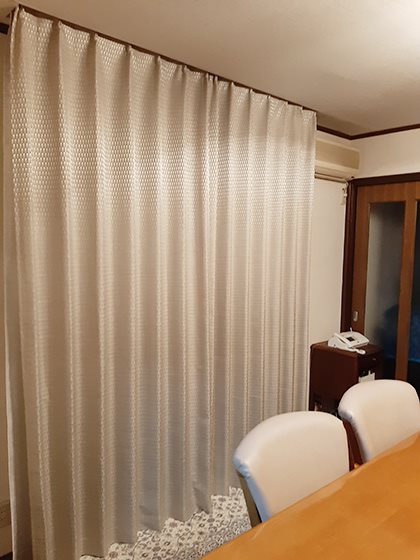 和モダンのカーテン がダイニングルームに合うか心配でしたが、とっても品がよく、スッキリと部屋が広く見