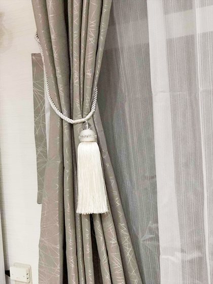 落ち着きのあるグレーのお色に白のタッセルのお色が重なって