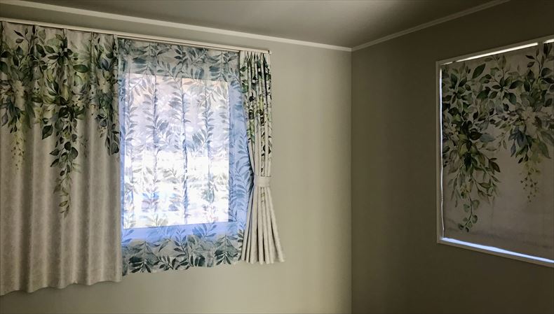部屋の雰囲気がガラッと変わり、カーテンが届く前とは別の部屋のようです。
