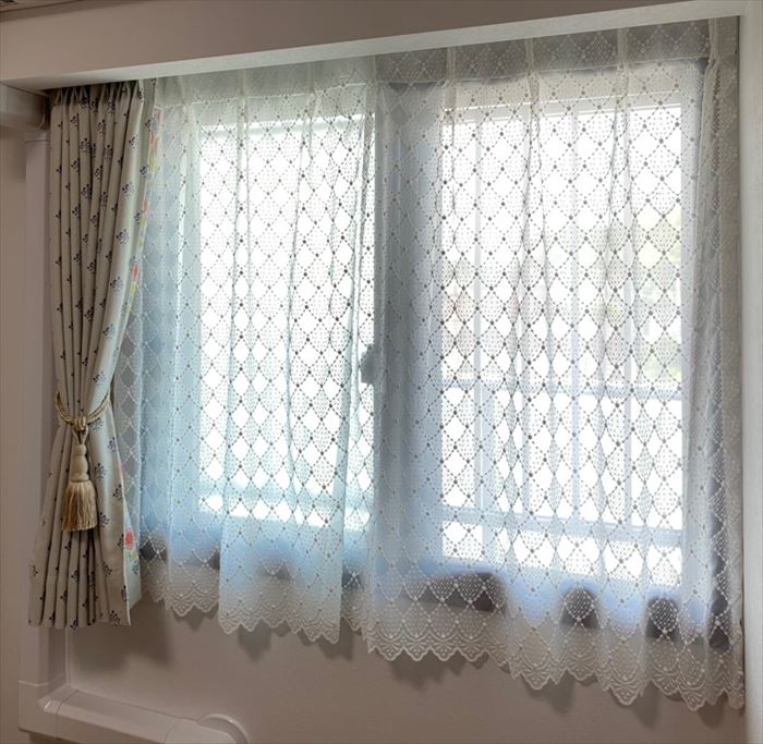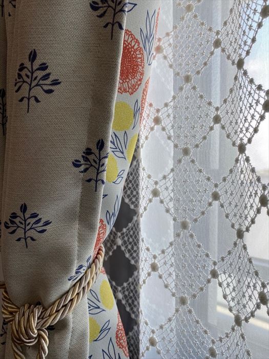 厚地カーテンは、レースを引き立てるシンプルで落ち着いた色と模様を選びましたが、