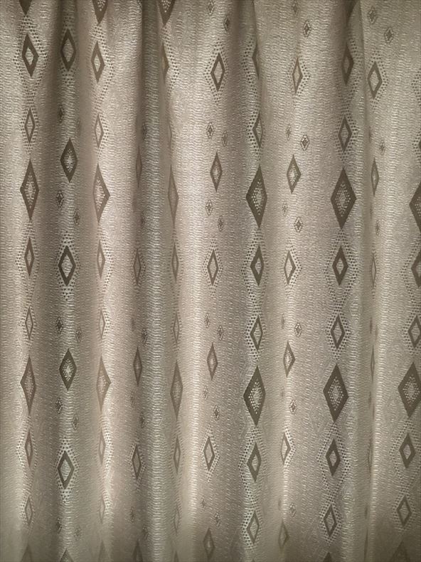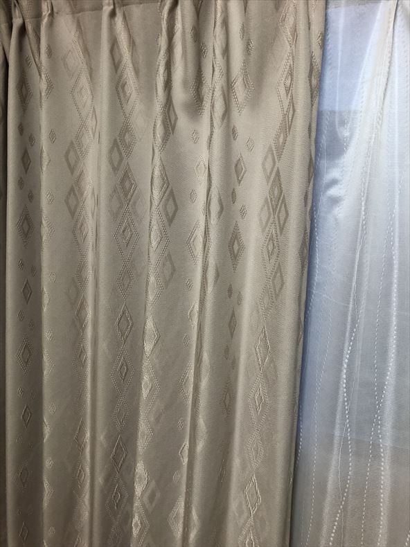 <クリスタン ベージュ>は、ツヤのある生地と立体的な織り柄が高級感たっぷりの遮光カーテンです。