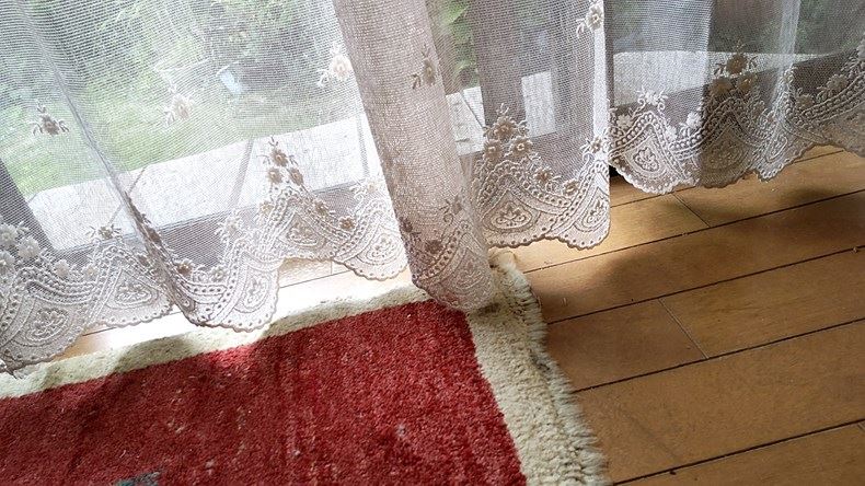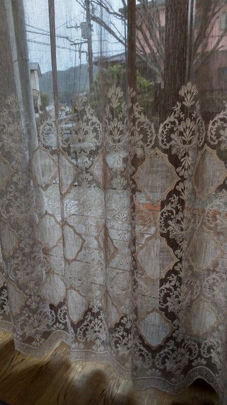 ざっくりとした麻のような風合いの質感に、細やかかつゴージャスなデザインは、大きなお窓にとてもよく映えておりますねヽ(*´Д`*)ノ