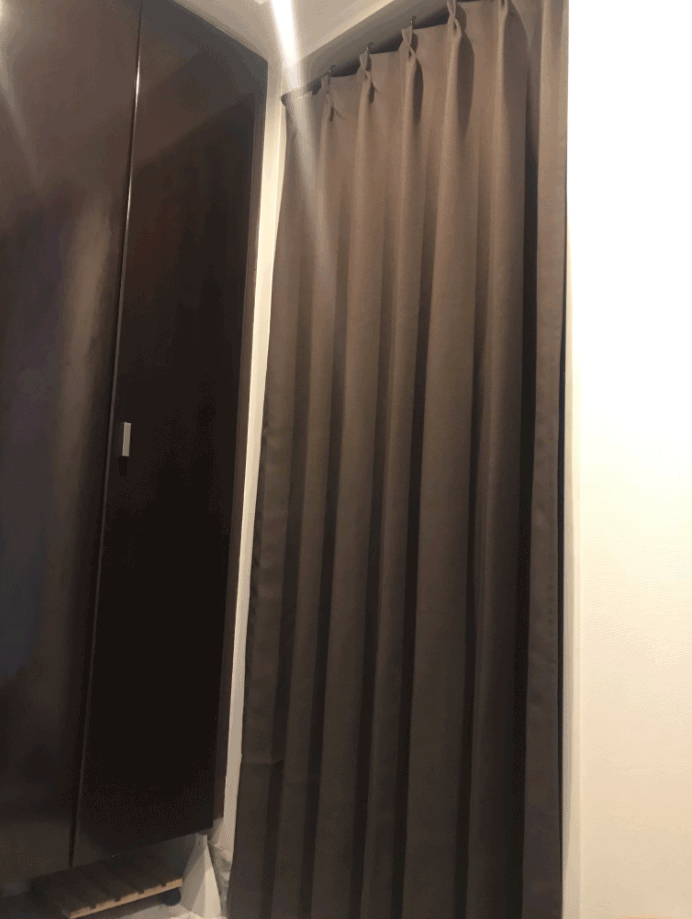 ネットではリビングと玄関ホールの境目や階段の下にカーテンを設置する例はあっても玄関ドアのところにカーテンを設置している情報は少なく、ドアにカーテンって…と思っていたのですが、狭いマンションですので、これ以上狭く感じない為にはドアのところへの設置一択でした。