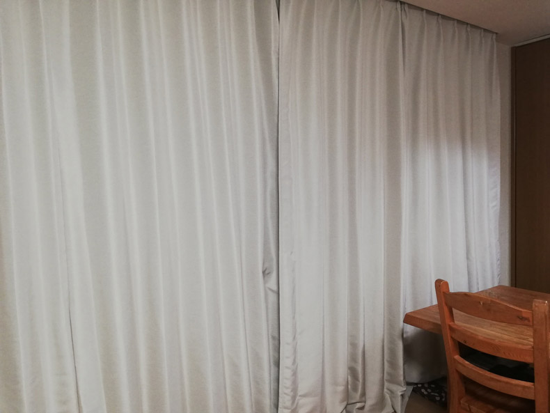 遮熱カーテンだと、厚地でごわごわのイメージでしたが、このカーテンは、この大きさでも大変柔らかい感じで、