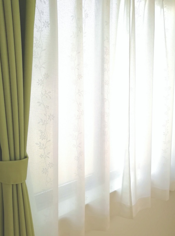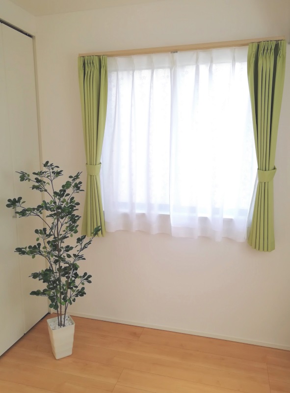 遮光カーテンのグリーンも爽やかな色ソフトな明るい色でした。