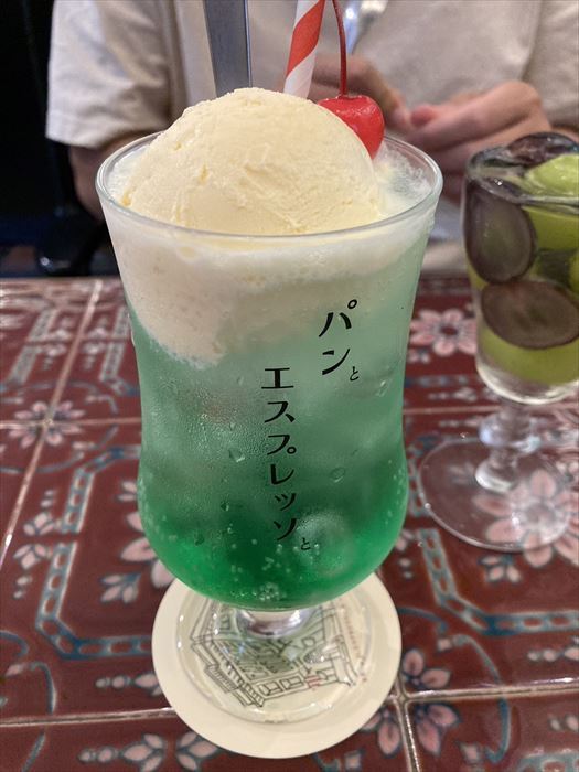 他にもみんな大好きメロンソーダ、グラスの文字もいい雰囲気…。奥に写っているのも同じく新メニューの葡萄ゼリーです。葡萄がギチギチで贅沢でした。