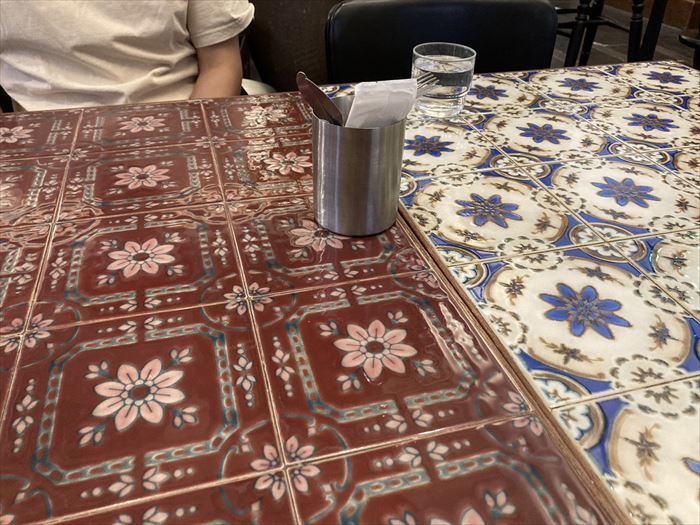 タイルでできたテーブルも非常に可愛くて、テーブル毎に違うタイルが使用されているのもレトロで華やかで気分があがります。