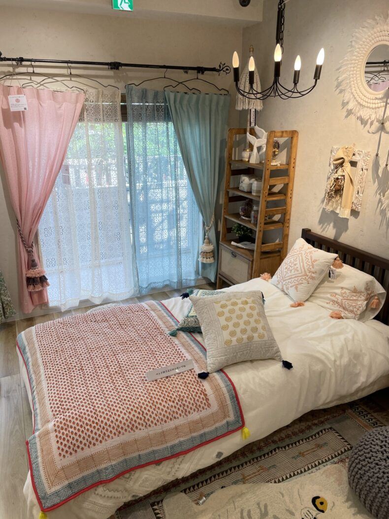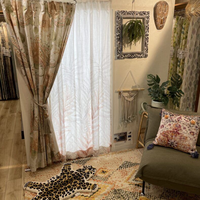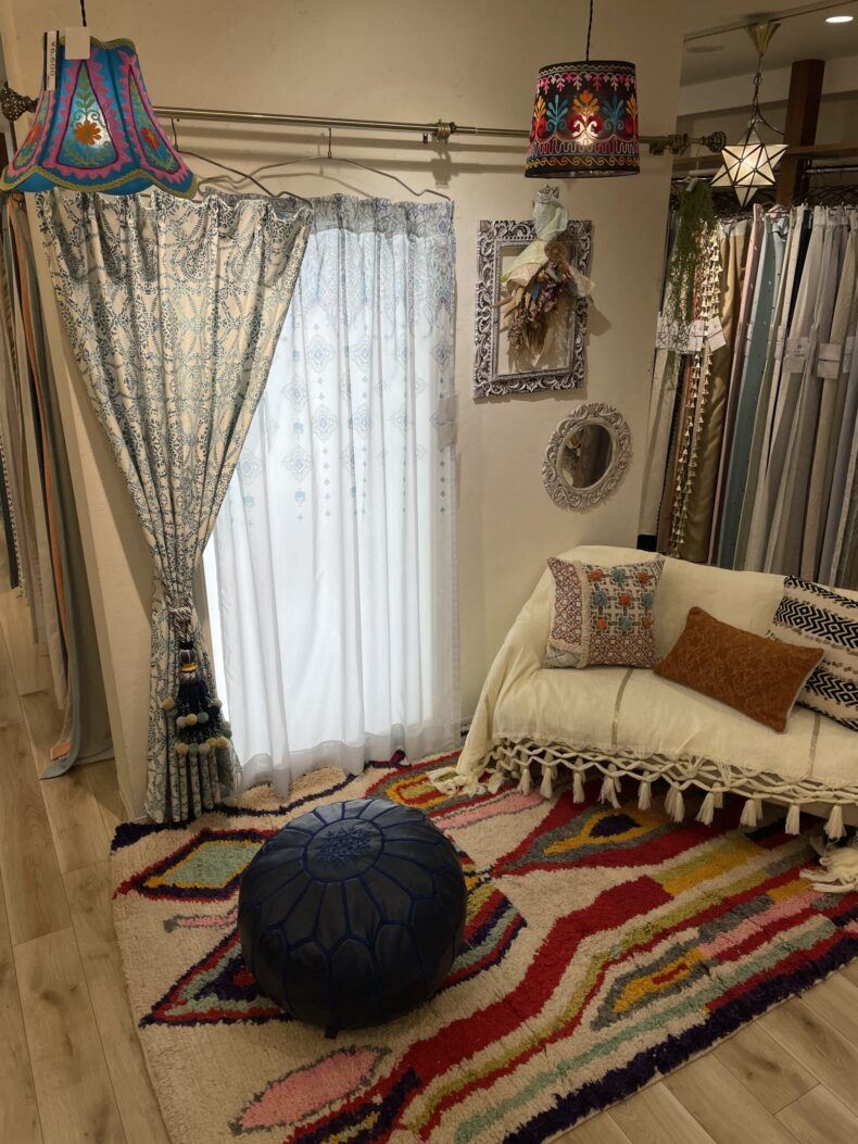 当店は気に入ったカーテンをラックから気軽に取り出して、用意されたお部屋に自由にコーディネートできるショールームで、店内は2層のフロアに分かれており一階が天然素材と北欧がメインで二階に、シャビーシック、ボタニカル、モロッカン、モダン、ボーホー等テイスト別でコーナーが分けております。