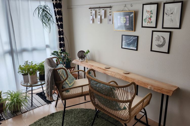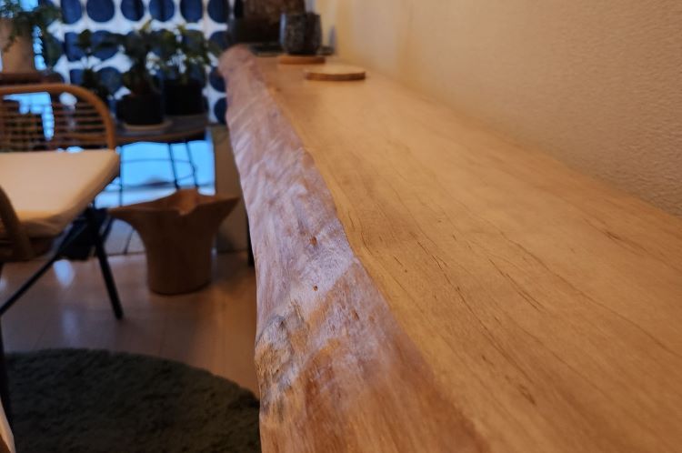 細長いカウンターのようなテーブルが部屋の端に欲しかったので、長い一枚板を探していた所、魅力的な楓の一枚板がありましたのでそれを購入しました。