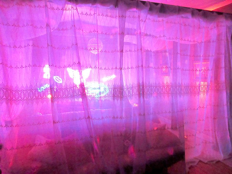 照明のマゼンタピンクのライティングで一般的なトルコ刺繍レースカーテンとは全くイメージが違って見えて驚きでした(;^ω^)