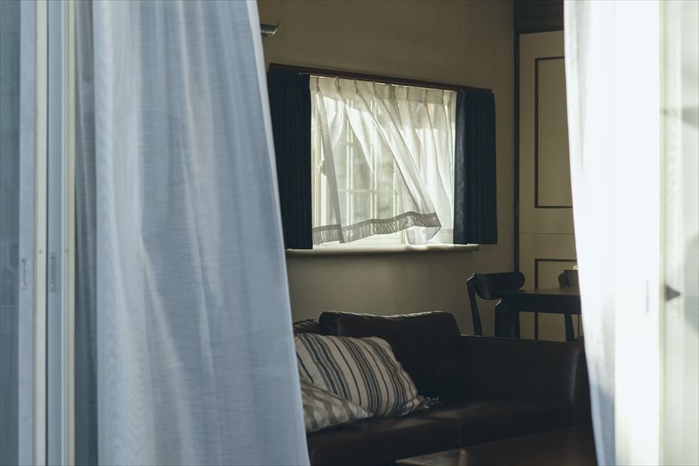 今回は、主人公一家のマイホームにシンプルな無地の<ユーカラープレーン>とシンプルなミラーレースカーテン<レース シャリエ(※販売終了)>をご使用いただきました。