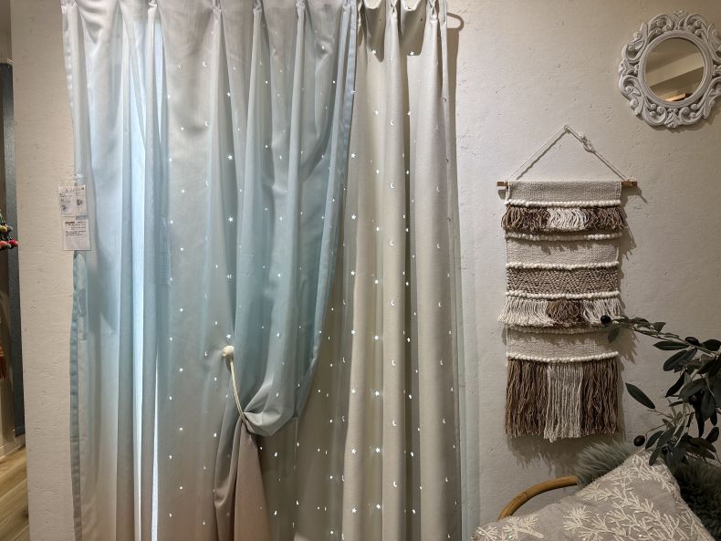 その後ろに掛けた<シャインスターズ アイボリー>のデザインで