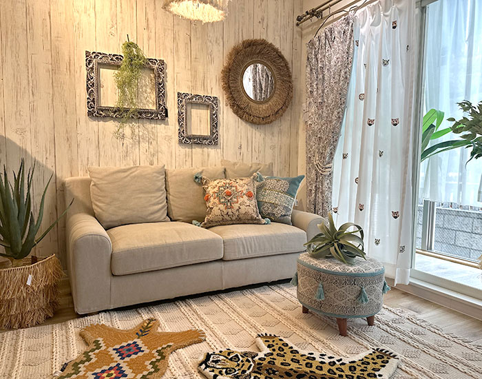植物がデザインされた個性的なカーテンを中心にコーディネート。