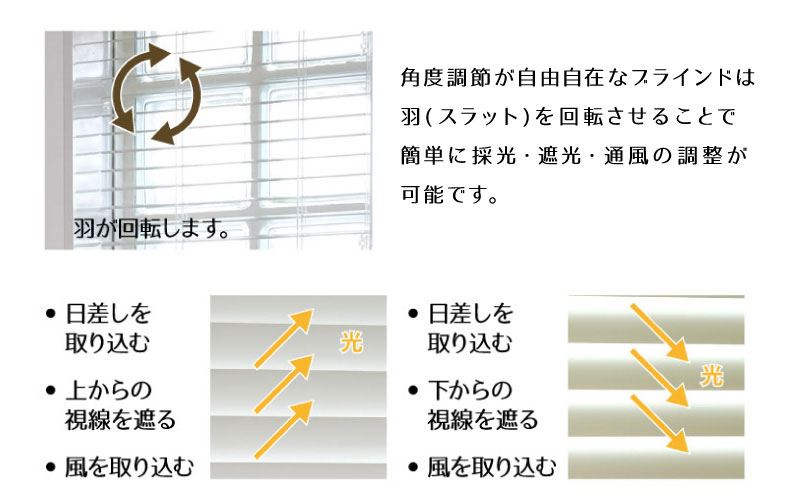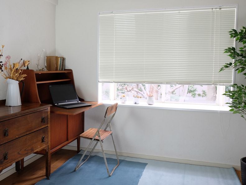 アルミブラインドは水平に並ぶスラット(羽)がシャープな印象なのでスタイリッシュな空間を演出してくれます。スラットを回転させることで採光や風の量を調整することができ、スラットの角度調整は自由にできるので採光や風の通る量も細かく調整することができるのでとても機能的です。