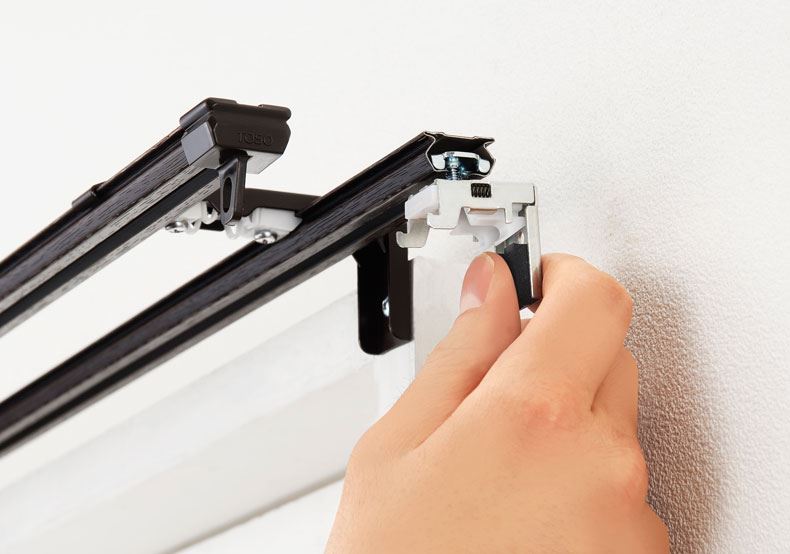 こちらのブラケットを使うことで機能性レールにブラインドを取付けることができるので、壁に穴を空けずに取付けが可能。