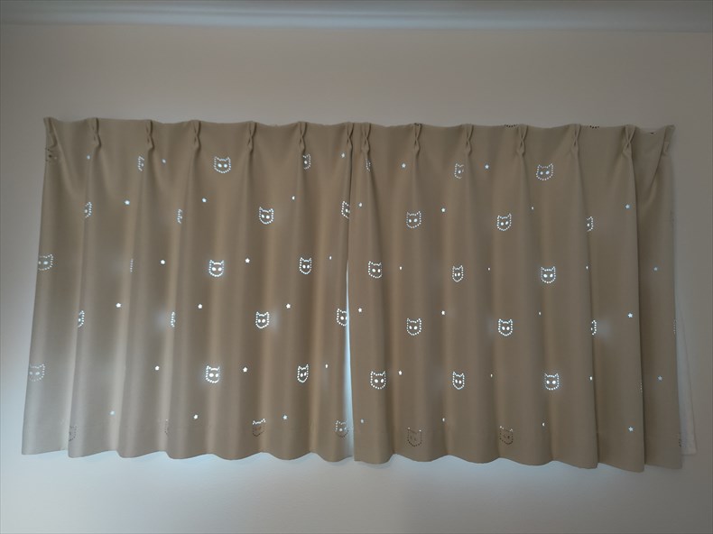 2級遮光の生地に超音波のくり抜きで猫ちゃんのお顔をかたどりました。