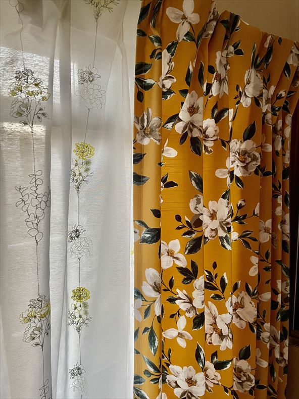 黄色のフラージュに合わせて、黄色の刺繍があるカーテンを選びました。