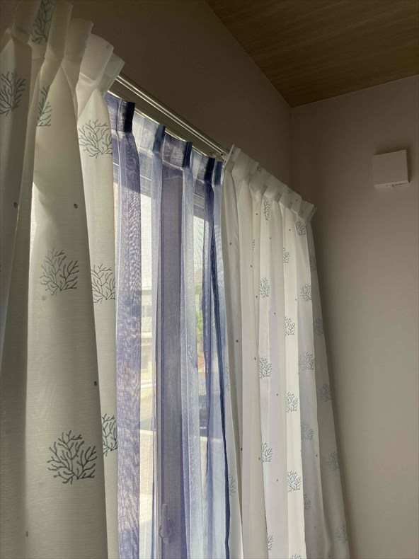 リビングにはエダ珊瑚?をモチーフにしたレースカーテンを一枚で使っていたのですが、何となく寂しくて、ブ