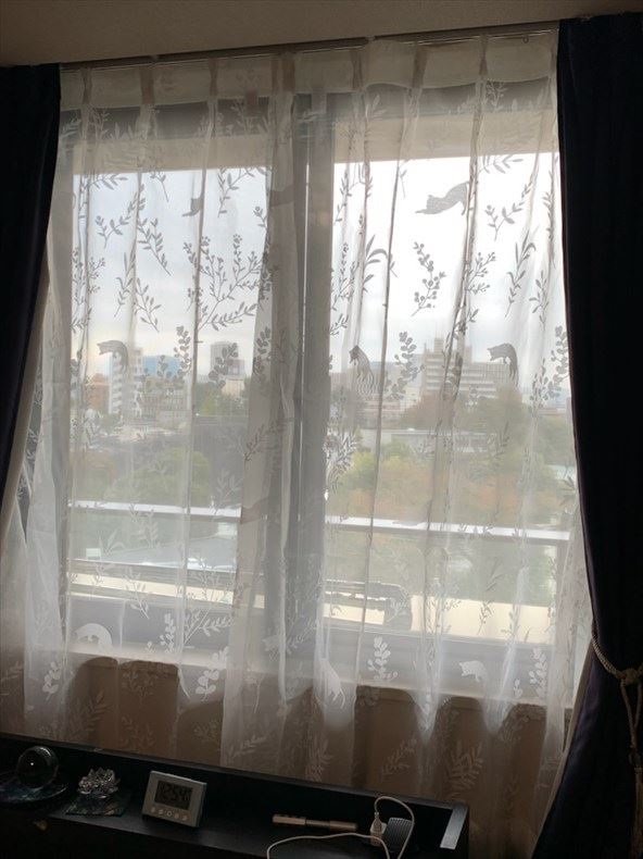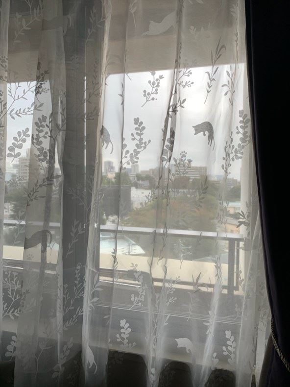 ふんわりと柔らかな素材感で透け感も高いレースカーテンなので、猫ちゃんのシルエットがしっかりと映えております♪