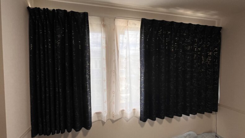 デザインのほかにも厚地カーテンは一級遮光で遮熱もついているのに重たく見えないのも特徴です。