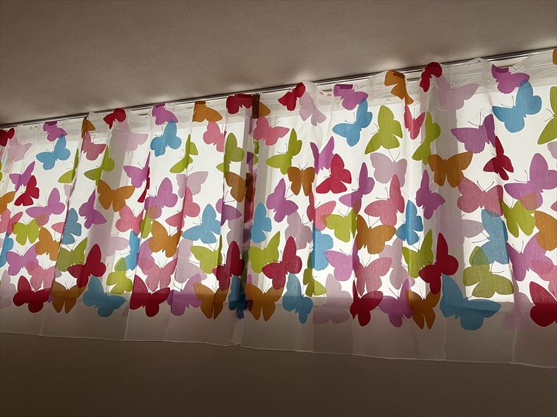 オパールプリントの透け感とバタフライ柄がとってもキュートなカーテンで、