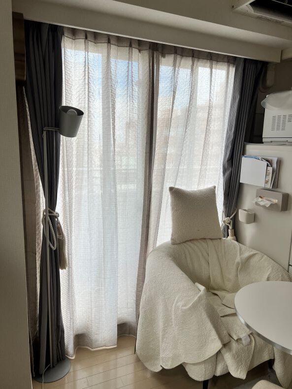 白を基本としたお部屋にしたいという希望がありましたが、全て白というのもどうかと思っていた所、ちょうどいいニュアンスカラーのグレージュっぽいレースを見つけて一目惚れに近く決定しました。