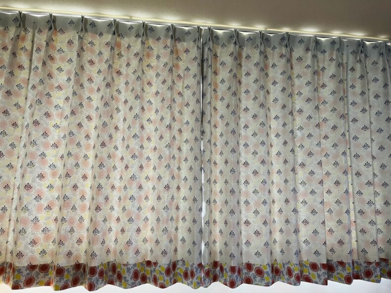 裏のデザインはこのカーテンの折り返しと同じ色とデザインで、外から見ても遊び心があり素敵ですので、ぜひ長くご愛用ください!