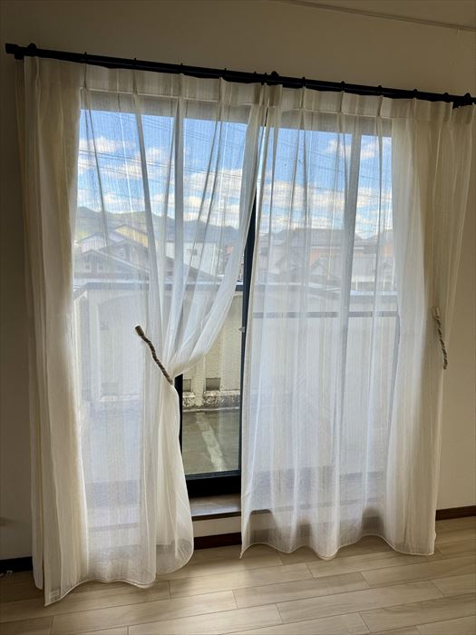 最後までお悩みいただいたレールのブラックもお部屋の雰囲気を引き締めており、フロントレースでお選びいただいた<ルグリオ>も柔らかい質感がリネンのカーテンと合っておりますね♪