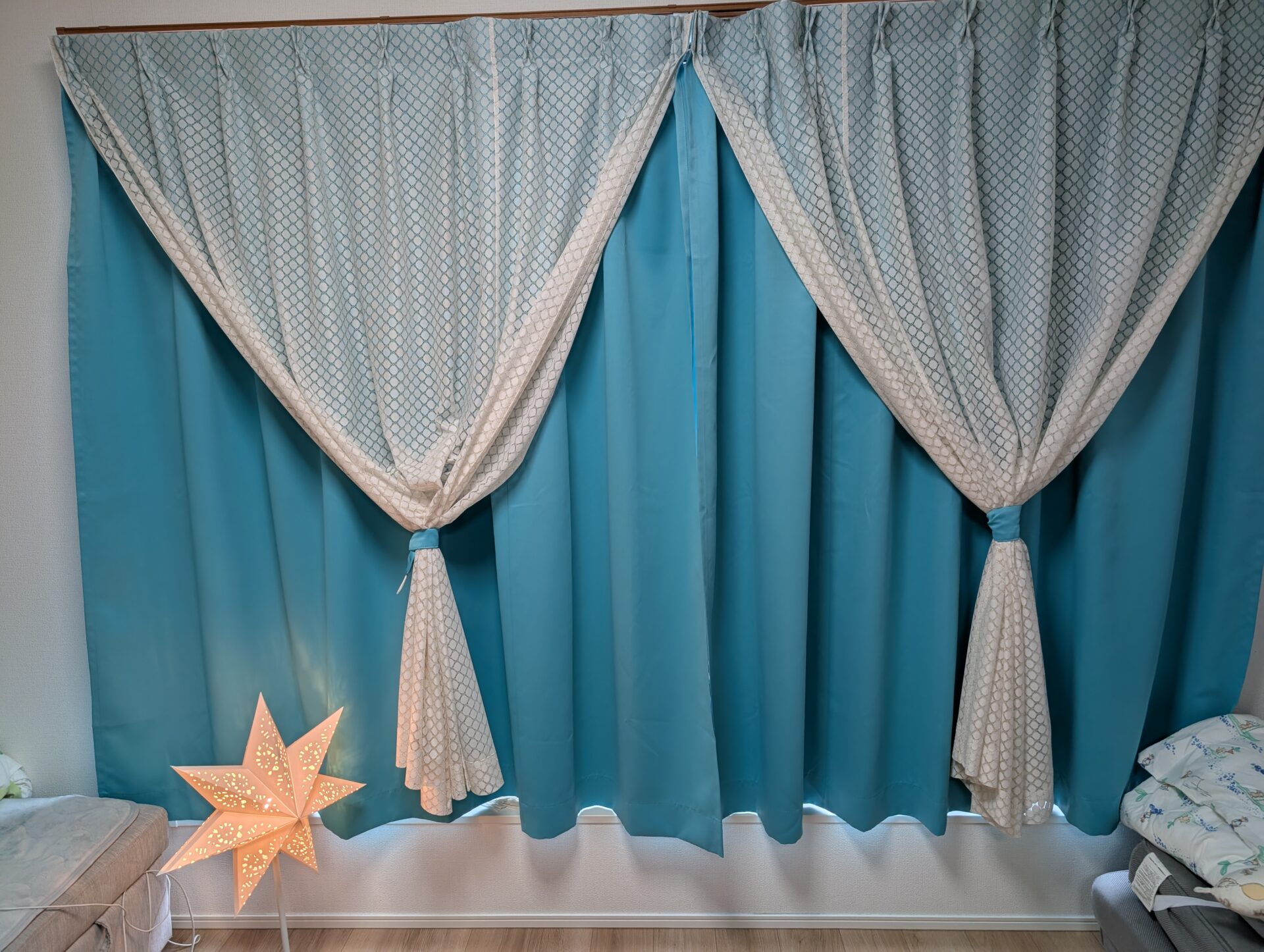 カーテンの色味はとても綺麗なブルーで、レースもとても可愛い柄でした。