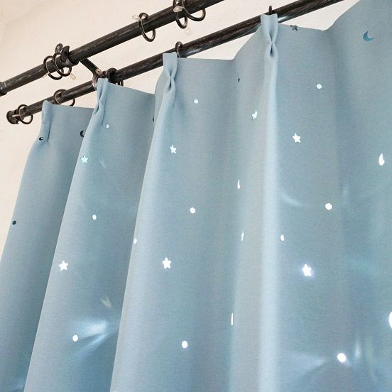 遮光生地に超音波で星や月の形をくり抜きました。そこから日光が差すと、キラキラと輝いてお部屋に素敵な影ができるんです。ロマンティックなデザインで、スタッフも一押しのカーテンです。