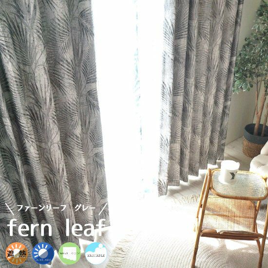 3. 裏地付「ダブル」 高級質感・形状記憶・遮熱・防音・遮光カーテン <ファーンリーフ グレー>
