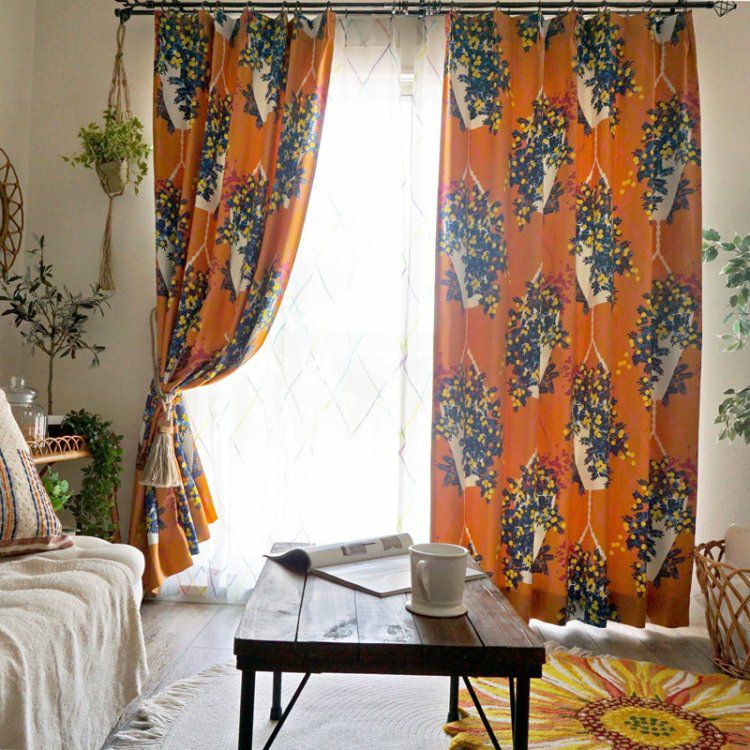 3. 【北欧VINTAGE】2級遮光・形状記憶付きカーテン <Hanging flower - ハンギングフラワー オレンジ>