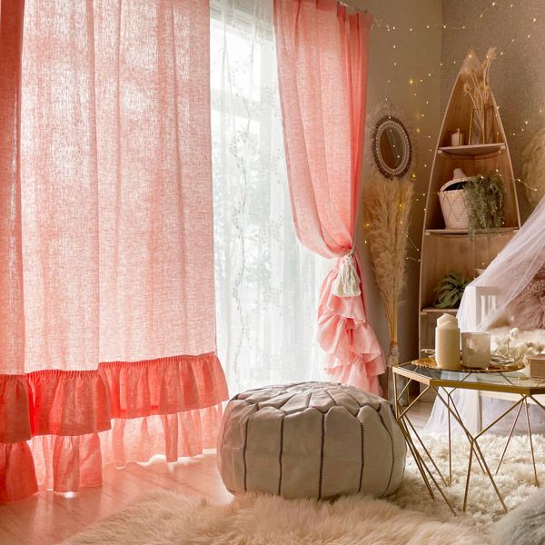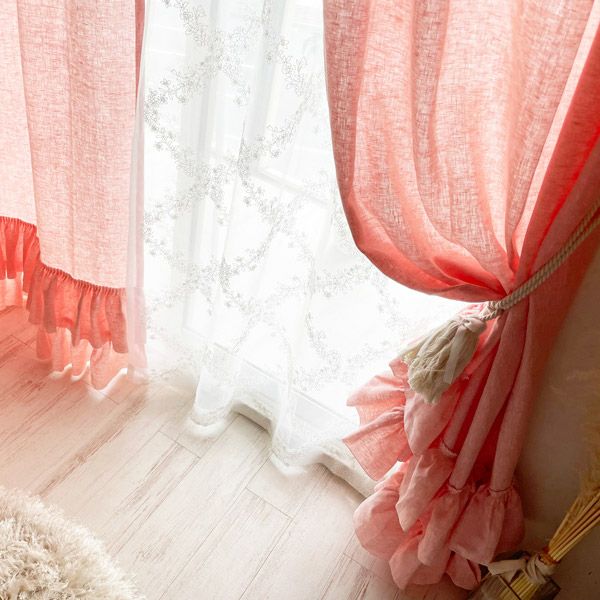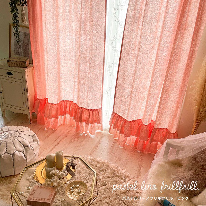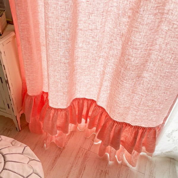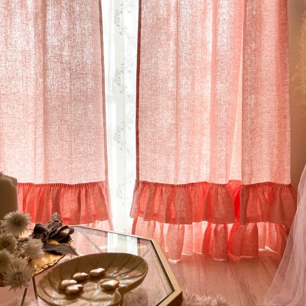 リネン100%の生地に2段のフリルをたっぷりとあしらったフェミニンでナチュラル感いっぱいのカーテンです。