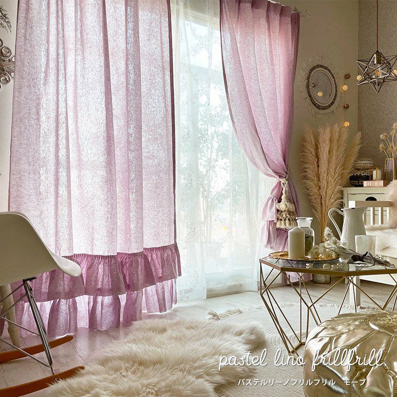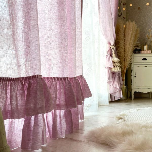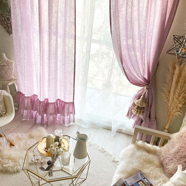 リネン100%の生地に2段のフリルをたっぷりとあしらったフェミニンでナチュラル感いっぱいのカーテンです。