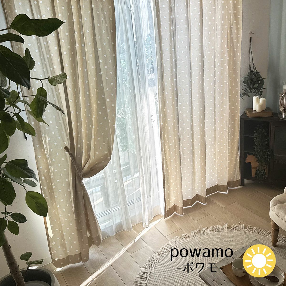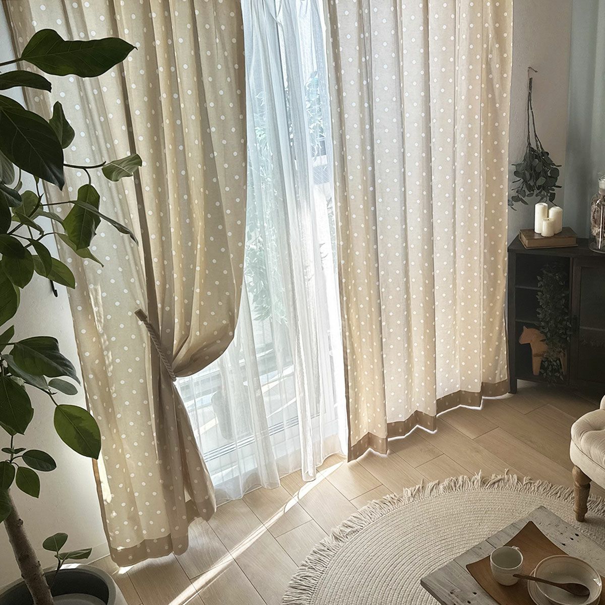 落ち着いたベージュにドットが映えるナチュラルカーテン。