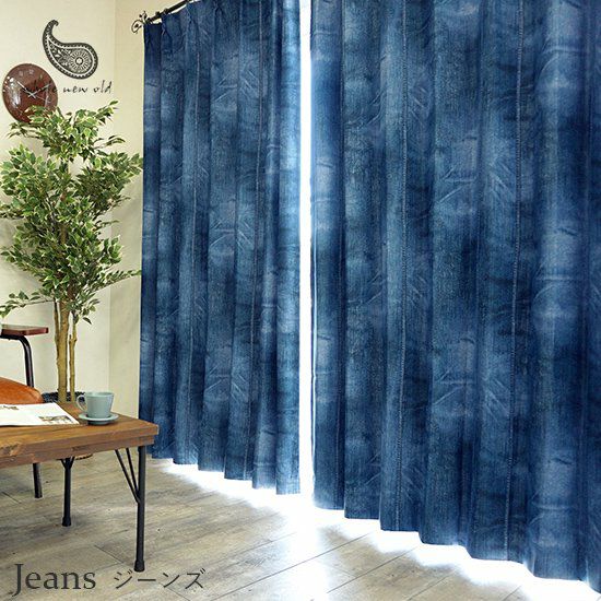 ダメージジーンズ柄が再現されたデザイン性の高いカーテン。