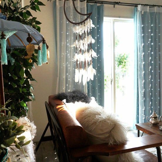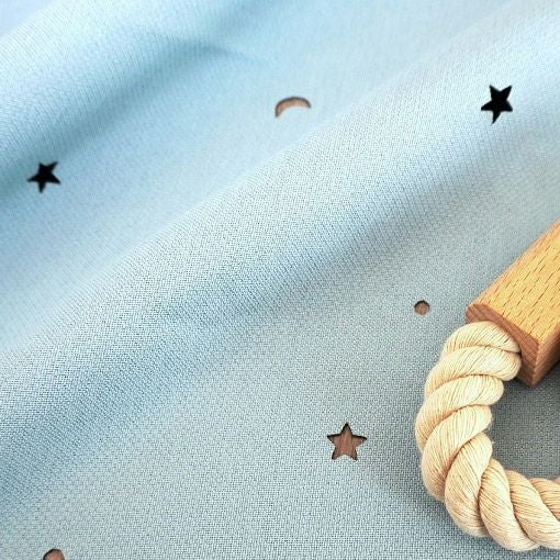 遮光生地に超音波で星や月の形をくり抜きました。そこから日光が差すと、キラキラと輝いてお部屋に素敵な影ができるんです。ロマンティックなデザインで、スタッフも一押しのカーテンです。
