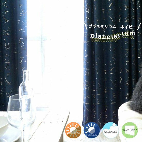 【星と月のデザイン】 キラキラ箔プリントがキレイな遮光・遮熱カーテン<プラネタリウム アイボリー>