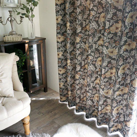 高級オーダーカーテンにも使用される上質なジャガード織りのテキスタイルを使用したカーテンです。 クラシカルなフラワーデザインと落ち着いたカラーが高級感のあるデザイン。