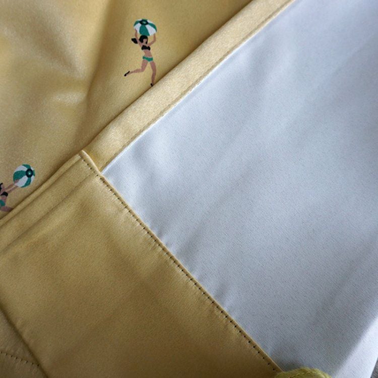 ビーチガールが楽しんでいる姿をリズミカルなドットパターンでデザインした遮光カーテンです。