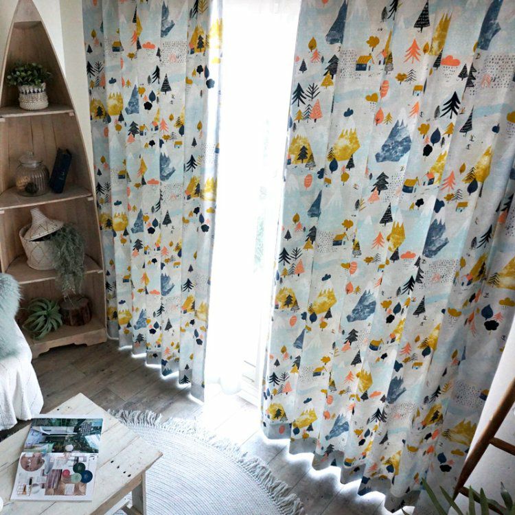 北欧デザインのおしゃれな洗える3級遮光カーテンです。 雪山で暮らす人やイエティがひっそりと隠れている楽しいデザインです。 可愛らしいカラーが子供部屋にもおすすめです。 イエティが刺繍された<レース イエティ>とぜひコーディネートをお楽しみください。