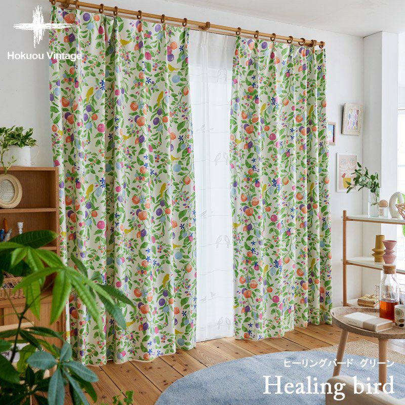 3. 【北欧VINTAGE】2級遮光・形状記憶付きカーテン <Healing bird - ヒーリングバード グリーン>
