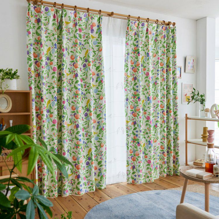 北欧デザインのおしゃれな洗える2級遮光カーテンです。 水彩タッチで描かれた果実が瑞々しいボタニカルな印象のカーテン。 小鳥が果実をついばむ様子がデザインされた癒しデザインです。 同じ小鳥をモチーフにした<レース リトルバード>とのコーディネートにぴったりです。