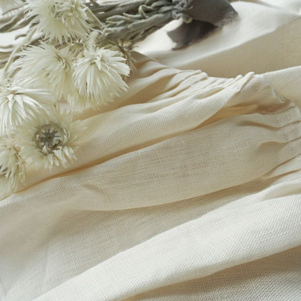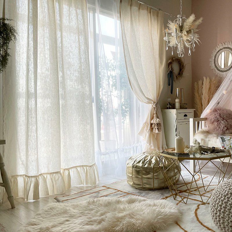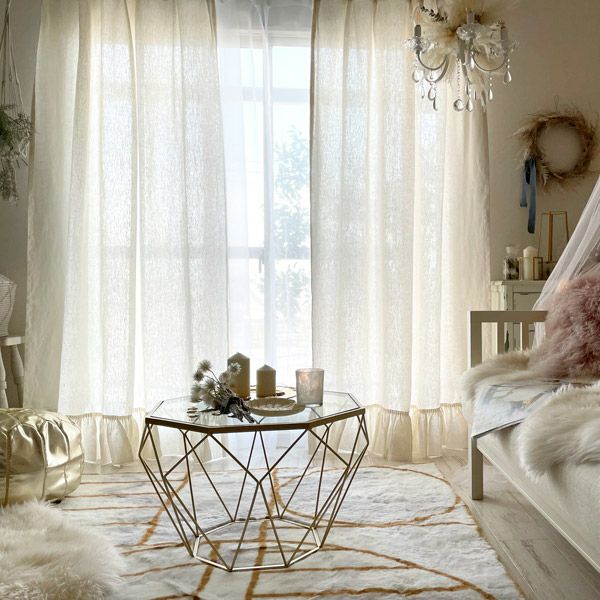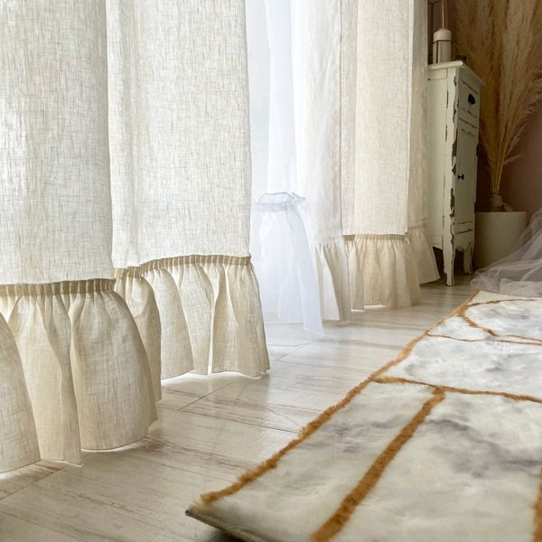 リネン100%の生地にフリルをあしらったフェミニンでナチュラル感いっぱいのカーテンです。