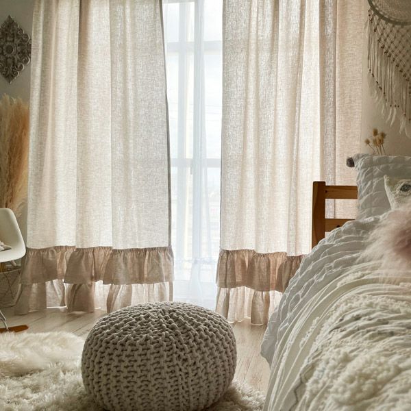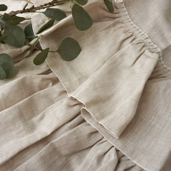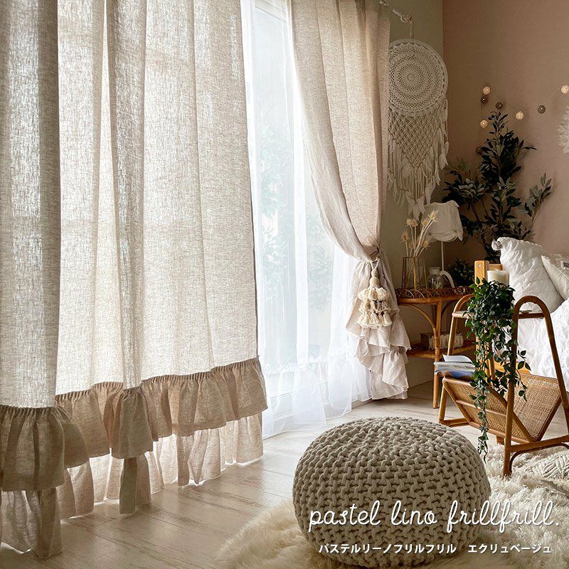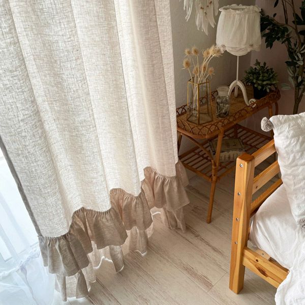 リネン100%の生地に2段のフリルをたっぷりとあしらったフェミニンでナチュラル感いっぱいのカーテンです。