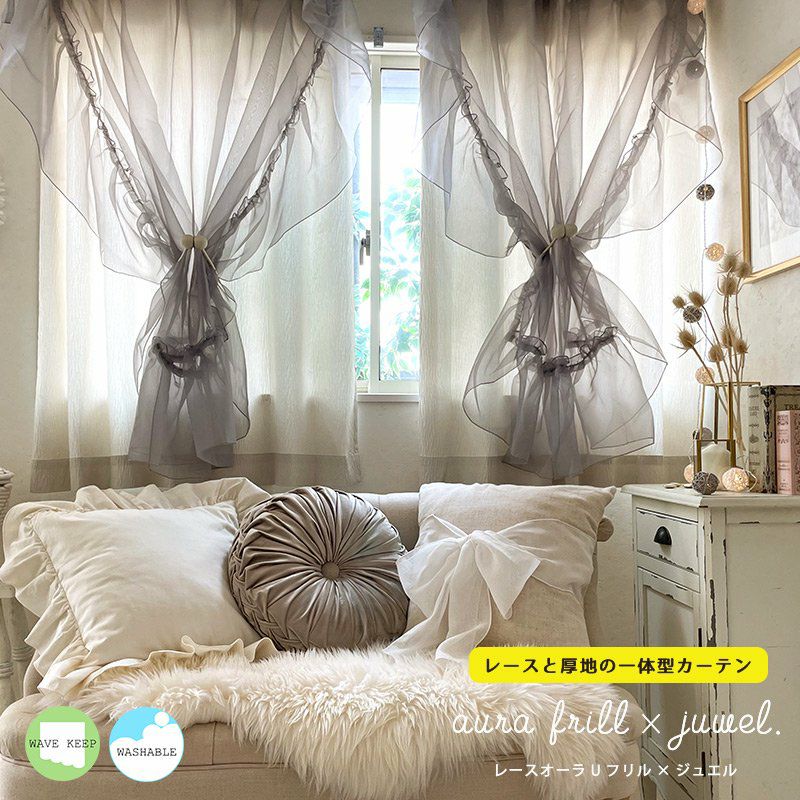 長さ約26cmのフリルをU字(両サイドと裾)にあしらった<レースオーラ Uフリル>と厚地<ジュエル>を上部で一体縫製にした手の込んだ縫製スタイルのカーテンです。